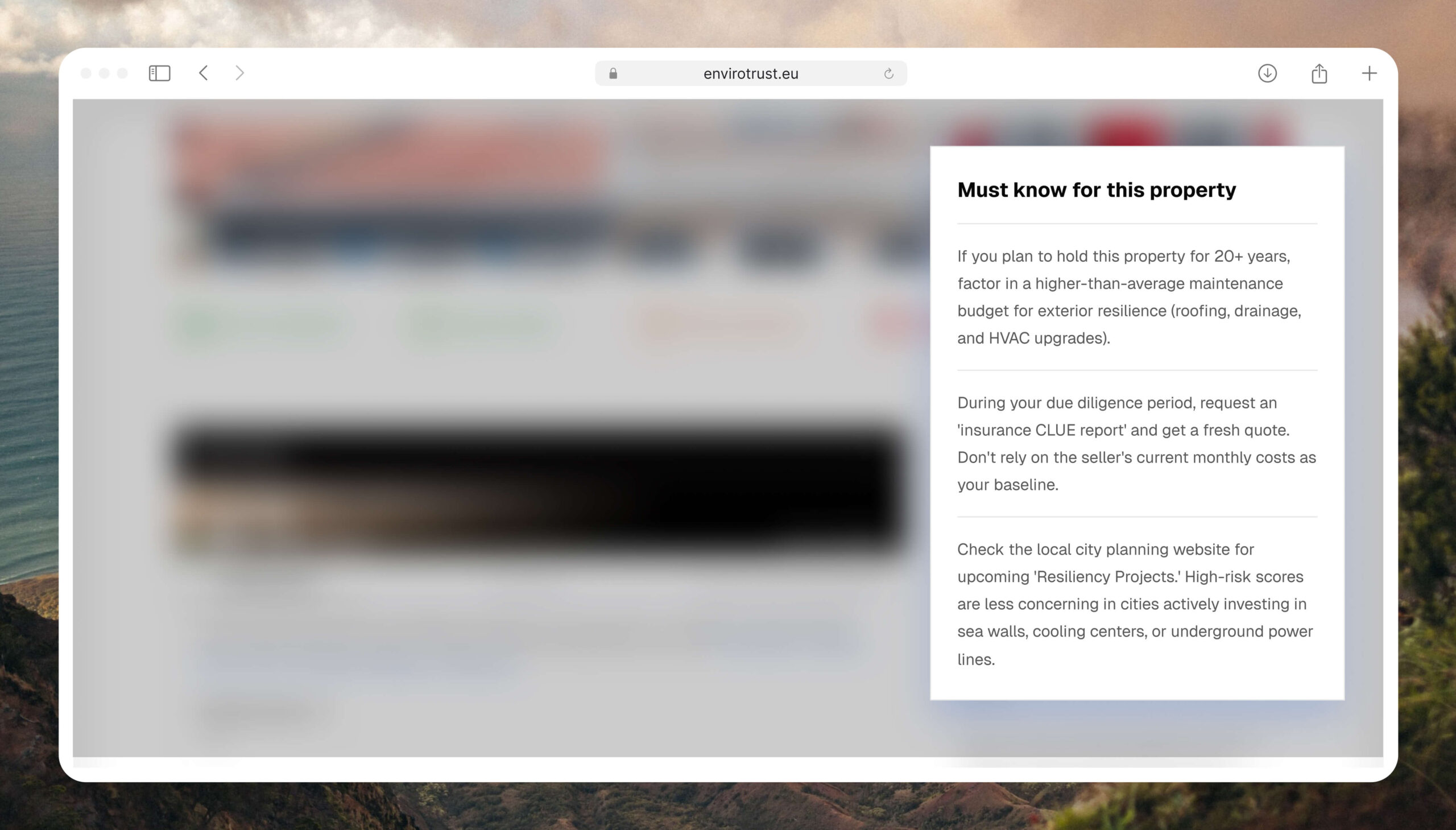 This widget UI keeps the data scan-able and non-overwhelming. Users instantly see, for example, that a home’s Flood Risk is High (score 78) while its Air Quality score is Good (42). The design uses consistent color cues (green/yellow/orange/red) and straightforward language. We also include a clear “Full Report” call-to-action. By clicking this button, users can explore the complete climate report on Envirotrust’s site. This approach follows the principle from climate UX research that interactive tools should “empower people and deepen their involvement” – once users see a concerning risk, they can immediately drill down.